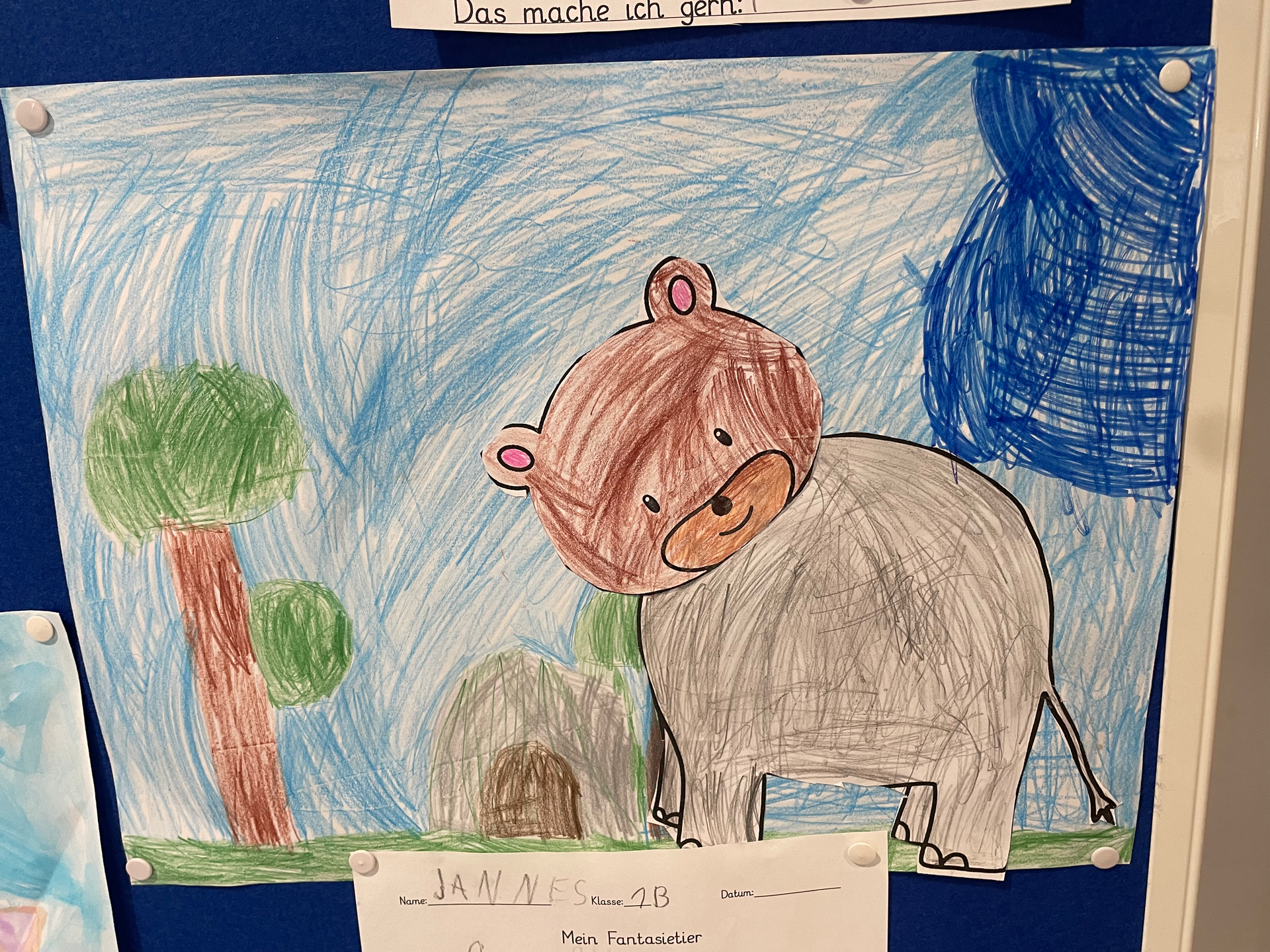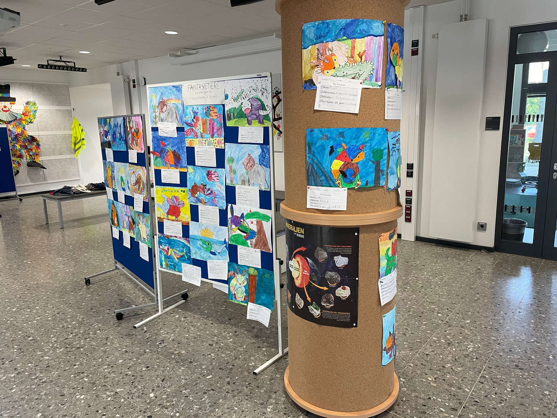 Im Kunstunterricht haben sich die Lerngruppen Bienen und Waschbären mit dem Thema Tiercollagen beschäftigt. Für ihre "Fantasietiere" haben die Kinder eine passendes Zuhause gemalt und sie kurzen Steckbriefen beschrieben. Aktuell können die Ergebnisse in einer Kunstausstellung im Foyer begutachtet werden.